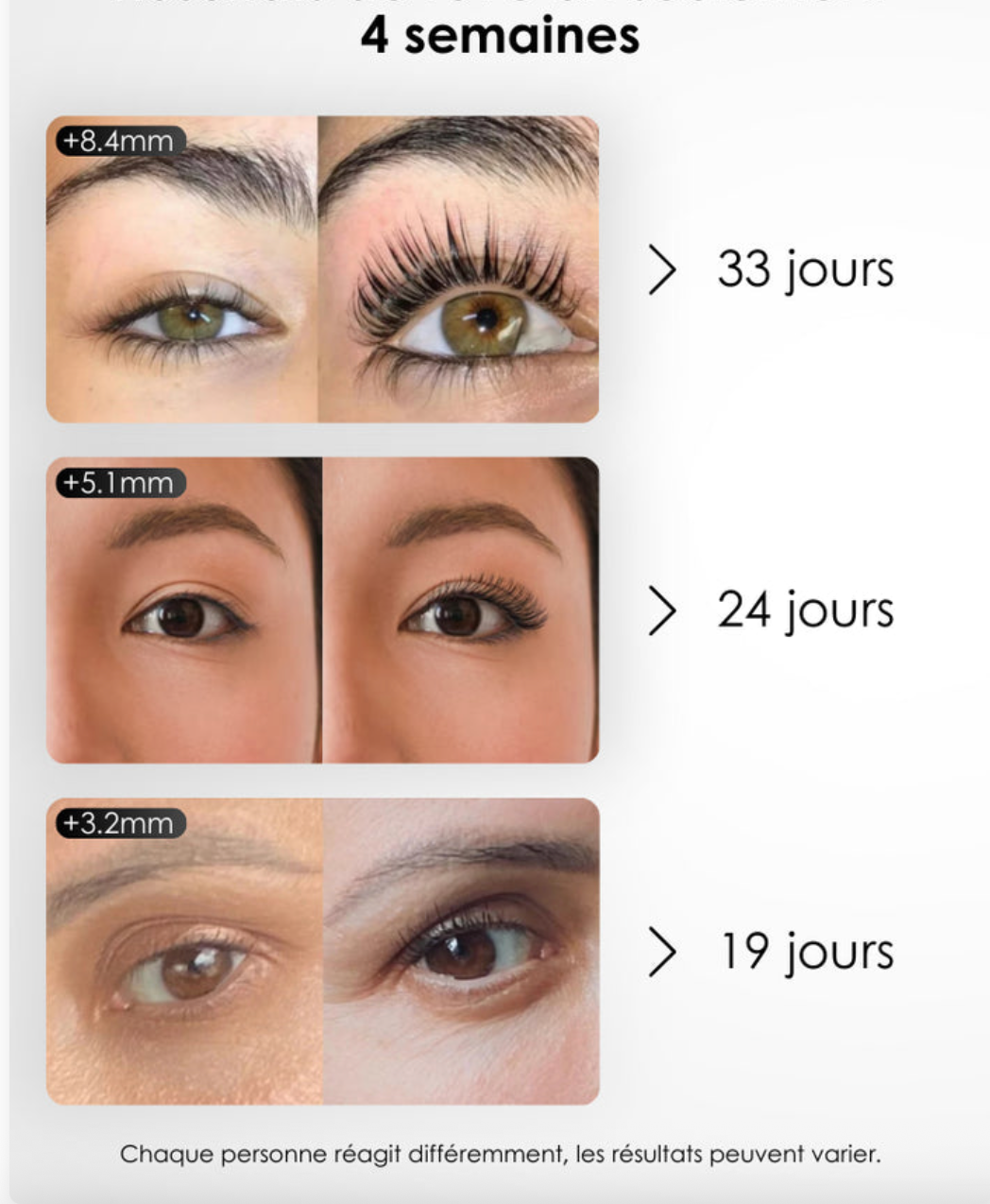 Conseil : Poursuivez l’application entre 2 et 4 semaines pour des cils plus longs, plus denses et plus forts.